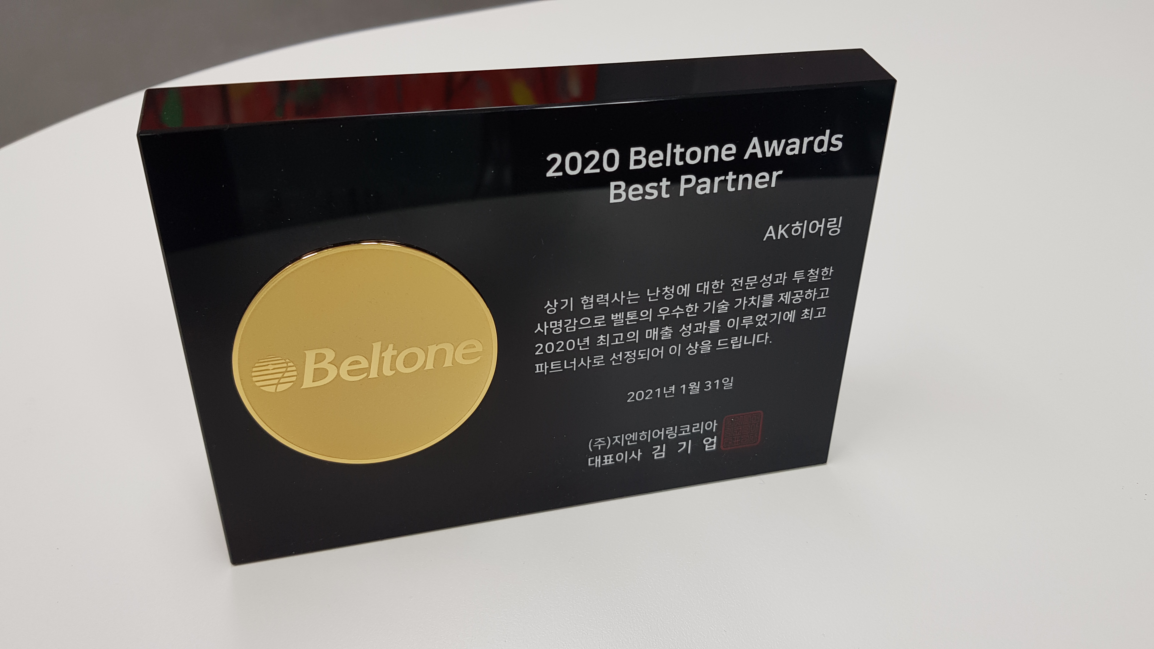 국내 보청기시장의 홀세일사업 선두기업 ‘AK히어링’이 2021년 1월 31일 글로벌청각기업 벨톤(GN HEARING)의 2020년 최고 파트너상을 수상하였다.