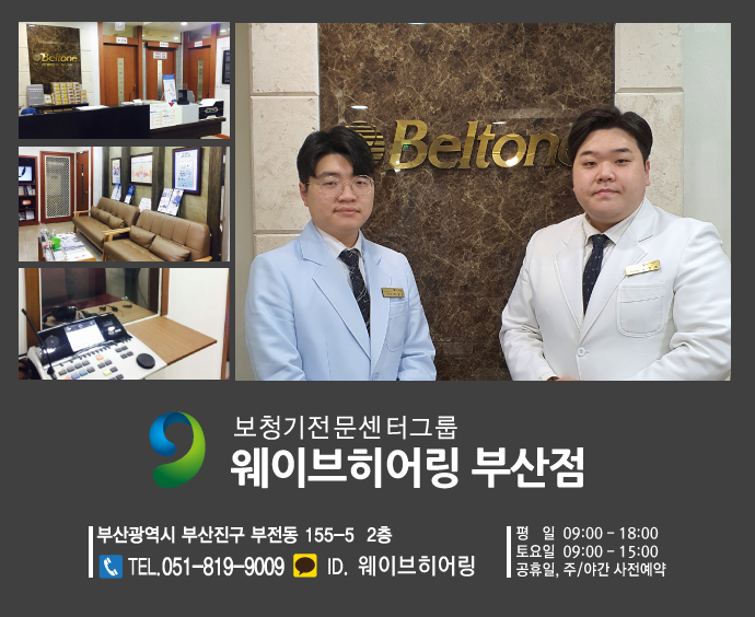 웨이브히어링 모든 직영점은 보청기 정부지원금 무료 상담과 청각장애등급 가능 여부 검사를 제공하고 있다. 또한, 코로나 바이러스 감염 예방을 위해 상시로 방역과 체온 측정을 진행하고 있으며, 고객 간에 동선 겹침을 방지하기 위하여 사전 예약제로 운영되고 있다. 궁금한 문의사항은 웨이브히어링 부산점(벨톤, 복음보청기) 고객센터 051-819-9009를 참조하면 자세하고 친절한 안내를 받을 수 있다.