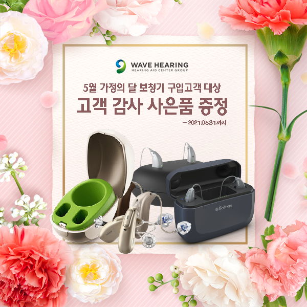 보청기/청각 전문가그룹 웨이브히어링(대표 송 욱)은 5월 가정의 달 맞이하여, 웨이브히어링 전국 직영점(종로/강남/영등포/이천/인천/대전/대구/부산/광주)에서 5월 1일부터 한달간 보청기 구매 고객에게 감사한 마음을 담아 사은품을 증정한다고 밝혔다.