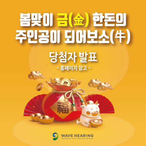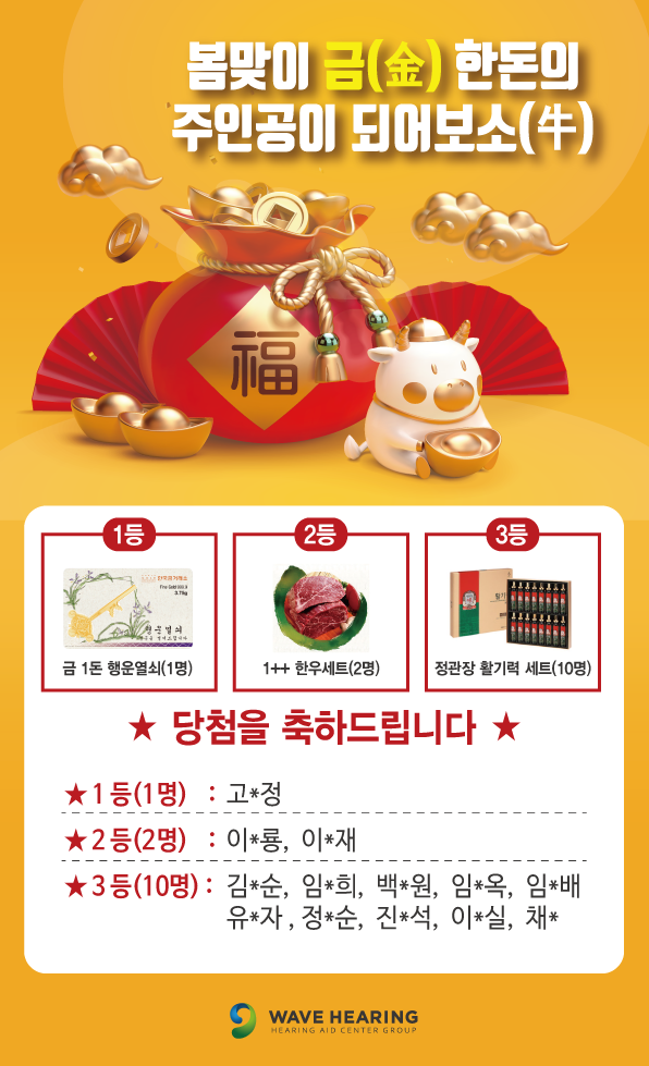 1등은 영등포점의 고*정님, 2등은 대구점의 이*룡님/인천점의 이*재님이 당첨되었다. 3등은 김*순, 임*희, 백*원, 임*옥, 임*배, 유*자, 정*순, 채*, 진*석, 이*실님으로 이벤트 당첨 확인은 해당 지점에서 개별적으로 연락을 진행할 예정이고, 웨이브히어링 공식 홈페이지를 통해서도 확인 가능하다.