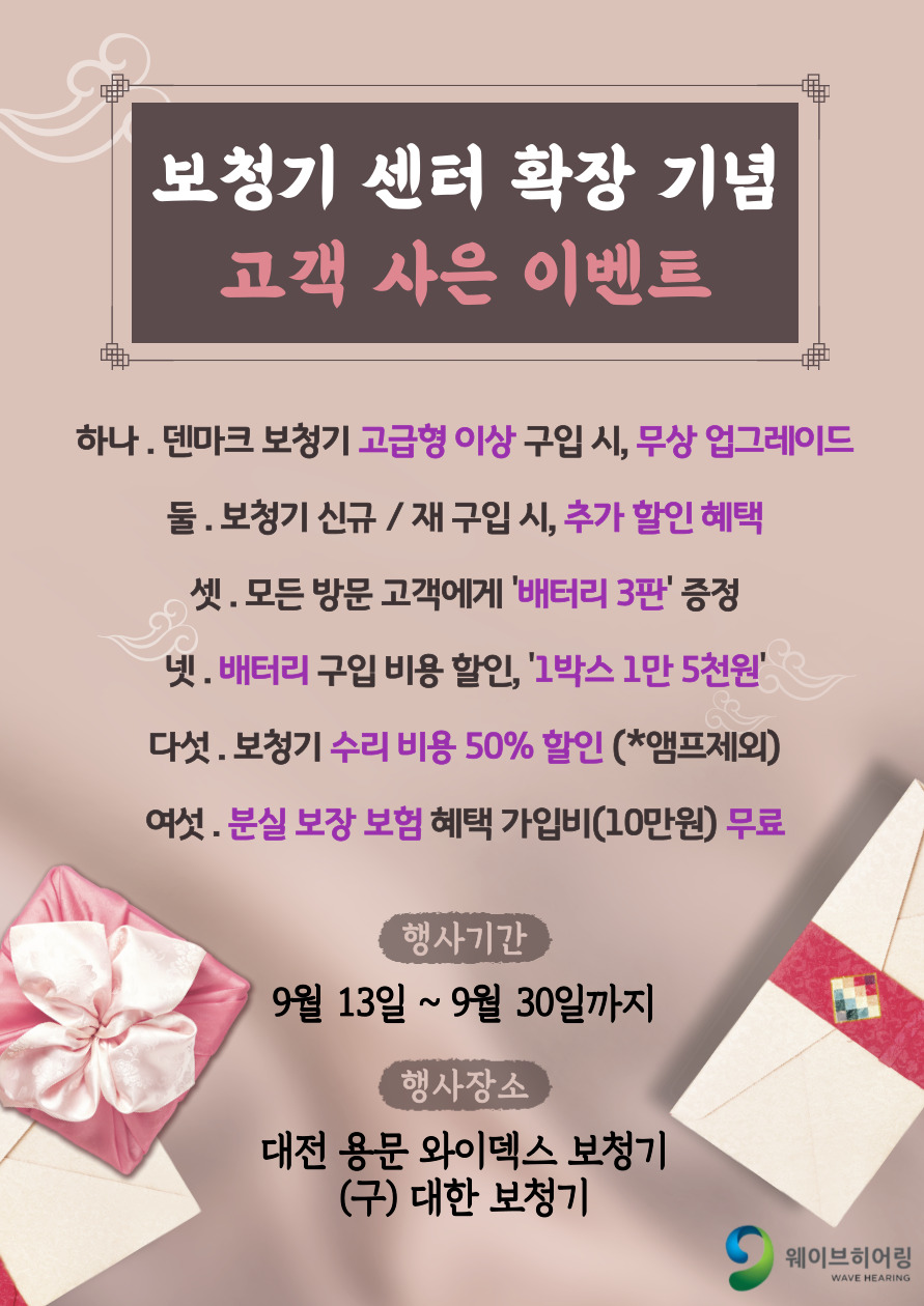 프리미엄 보청기 전문센터 그룹 웨이브히어링 대전직영점은 센터 확장 공사 기념 고객 사은 행사를 10월까지 약 2달간 진행한다고 14일 밝혔다.