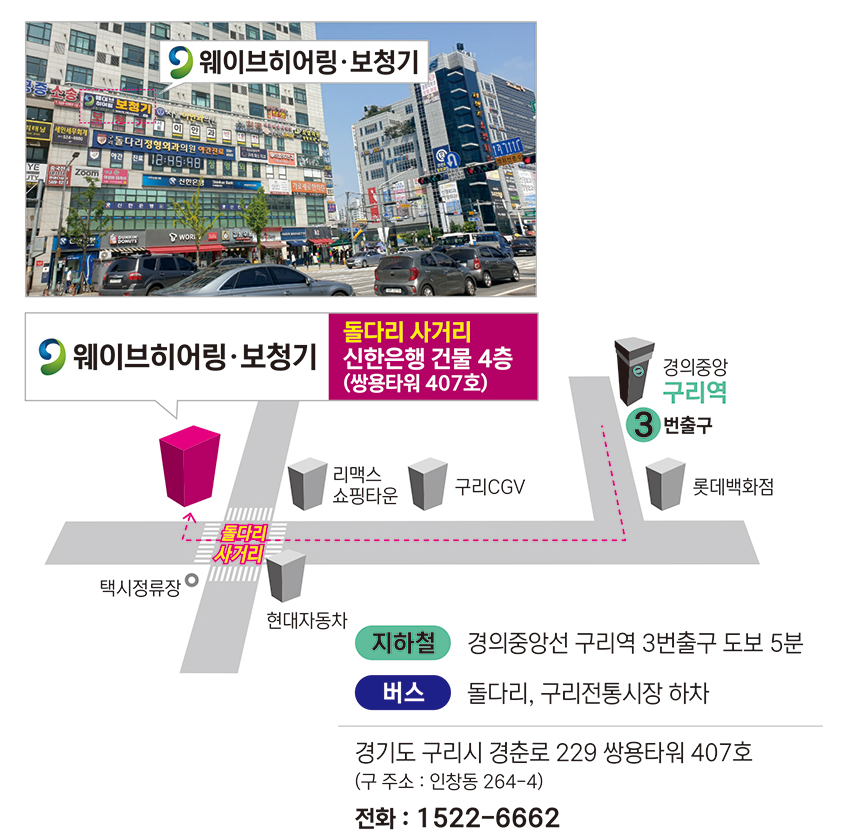 웨이브히어링 구리센터는 고객이 찾아오기 편하도록 구리시의 명소인 돌다리사거리 대로변에 위치하고 있으며, 본 건물 및 바로 뒤 제4공영 노상주차장까지 있어 구리역세권임에도 차량을 이용해 편리하게 이용할 수 있다.