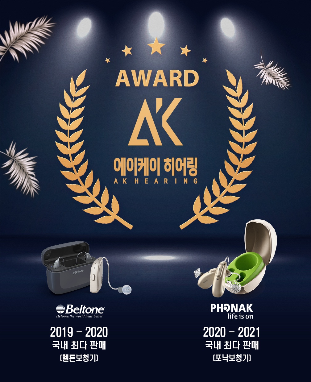 ㈜AK히어링은 지난 2019년 글로벌 제조사 벨톤, 포낙, 와이덱스 등과 전략적 파트너로 공급계약을 체결해 다양한 브랜드를 공급하기 시작, 2019년~2020년 지엔히어링코리아의 벨톤보청기 국내 최다판매로 최고 파트너상을 수상한 이력이 있으며, 이에 이어 2020~2021년 포낙보청기 역시 국내 최다판매로 최고 파트너상을 수상한 부분이다.