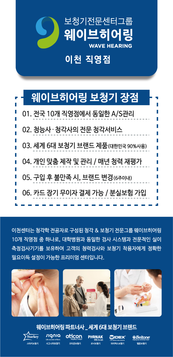 웨이브히어링 이천점은 이천 지역에서 유일한 오티콘보청기 전문점으로 이천 인근 지역에서도 많이 방문하는 보청기 전문 센터이다.