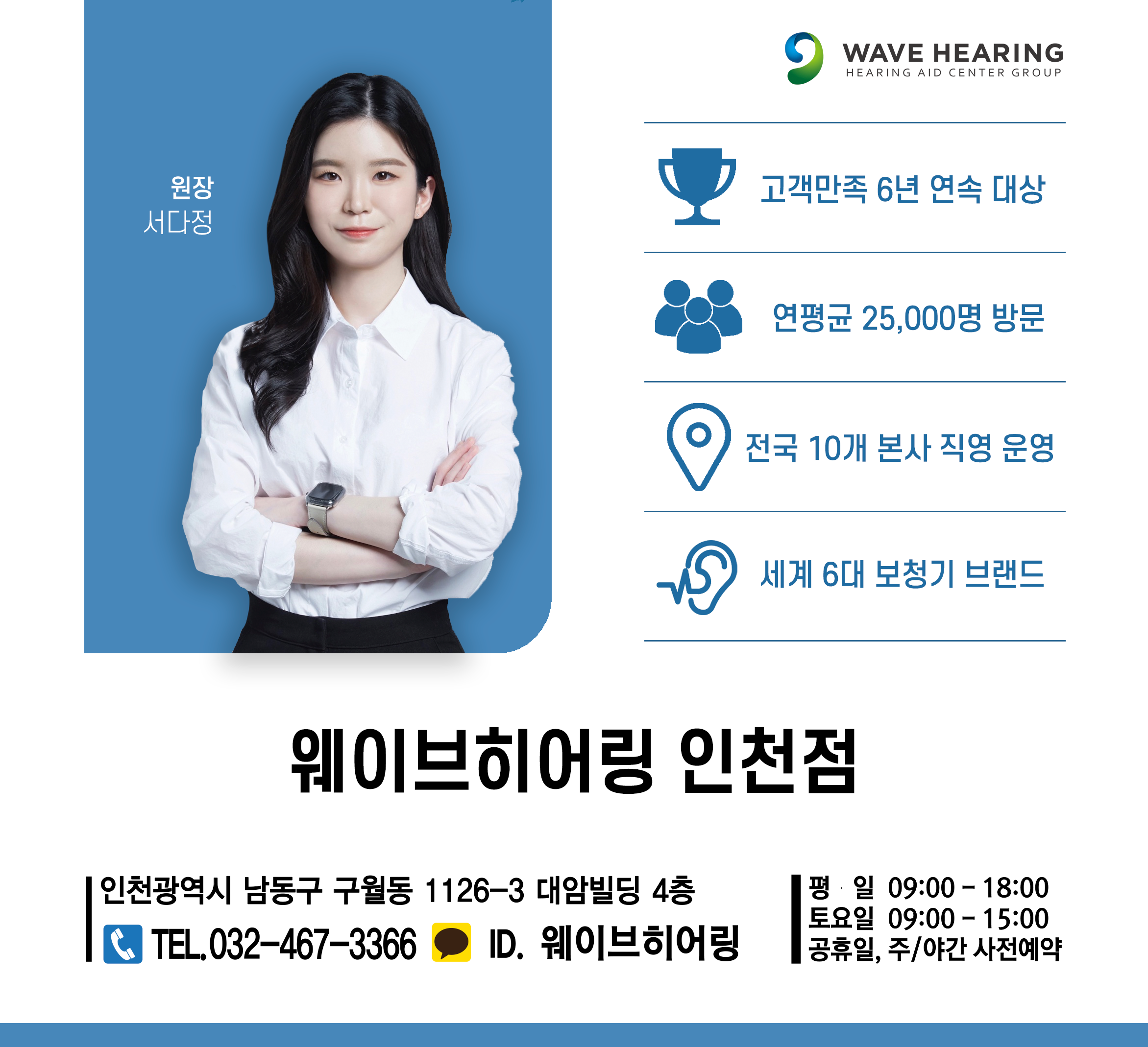인천 구월동(예술회관역)에 위치한 웨이브히어링 인천점은 여름철 휴가 이후로 보청기 점검의 필요성을 강조하였다. 보청기 내부의 습기 제거 및 내부 점검으로 보청기 고장을 미리 예방할 수 있고 보청기 소리 청취에 불편사항이 있다면 곧 다가올 추석 전에 미리 소리 조절(피팅)을 받아 반가운 가족, 친척들과 즐거운 한가위를 보낼 수 있다고 웨이브히어링 인천점 서다정 원장은 전하였다.