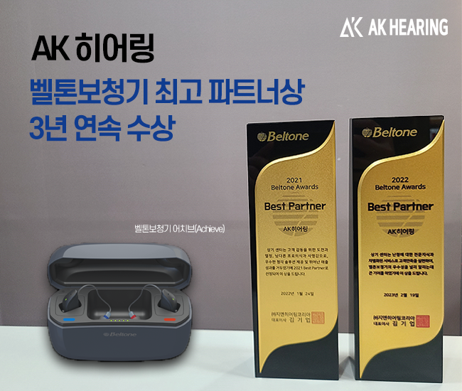 벨톤(Beltone)은 덴마크 지엔히어링 그룹의 보청기 브랜드이며, ㈜AK히어링은 2019년 창업부터 지금까지 3년 연속으로 벨톤 보청기 최다판매 기록을 갱신하며 최고 파트너 상을 수상한 부분이다. 2023년 상반기에는 ㈜AK히어링과 함께하는 다양한 제조사들의 신제품이 출시되었으며, 이로 인해 ㈜AK히어링을 통하여 제품을 공급 받는 보청기 리테일 샾에서는 더 많은 청각서비스를 제공할 수 있을 것으로 보여진다.