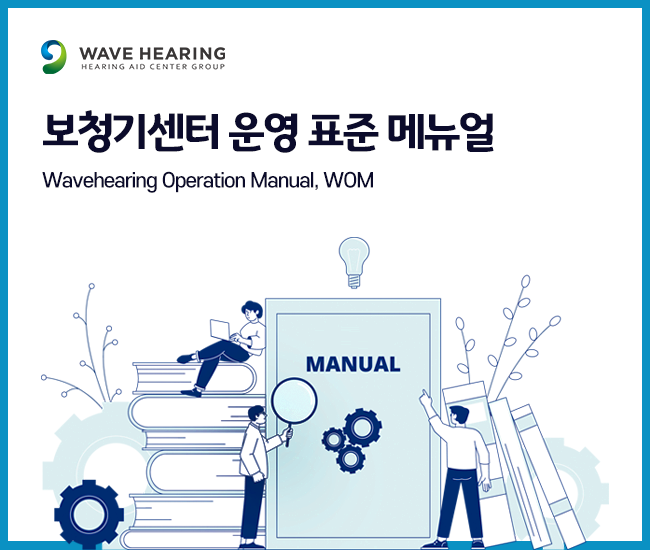 웨이브히어링 보청기센터 운영 표준 메뉴얼(Wavehearing Operation Manual, WOM)은 고객 기록저장 및 알림, 전화 응대, 방문 응대, 6대 제조사 관련 업무, 정부지원보청기 안내와 같은 고객관련 업무와 센터의 전반적인 운영을 위한 매출 관리 및 온라인/오프라인 마케팅관련 안내까지 출근부터 퇴근까지 센터에서 실행해야 할 모든 업무/절차를 담고있다.