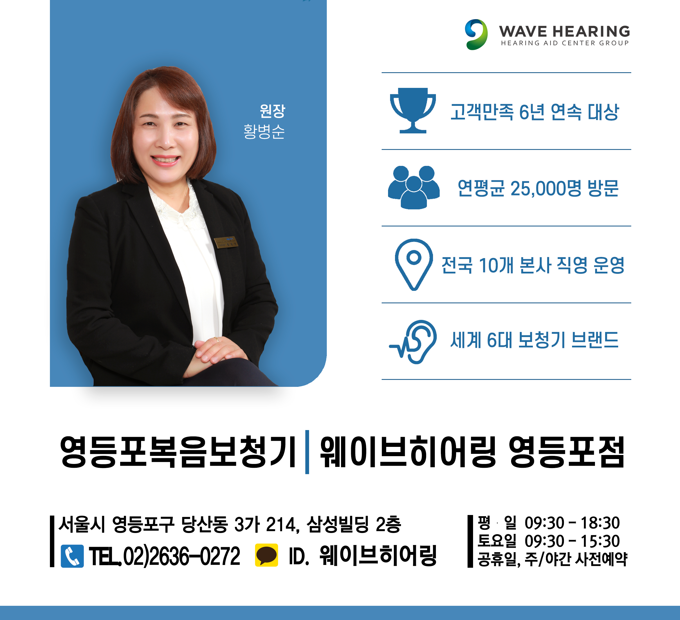 웨이브히어링은 Audiologist 30명이 제공하는 보청기 청각전문 서비스 기업으로 전국 11개의 센터가 모두 본사직영 네트워크로 운영되며, 매년 약 3만명의 가까운 난청 고객들에게 보청기, 청각 관련 서비스를 제공하고 있다. 5월 가정의달 보청기 기획전과 지인 소개 이벤트에 대한 내용은 웨이브히어링 영등포점으로 전화 시 안내 받을 수 있다.