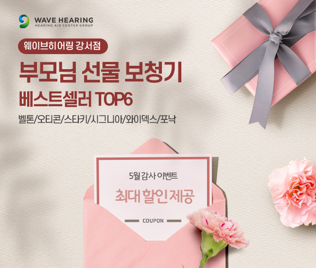 5월 가정의 달을 맞이하여 <웨이브히어링 강서점>에서 부모님 보청기 선물로 적합한 6대 브랜드 중에서 엄선하여 선정한 브랜드를 중심으로 가정의 달 할인 이벤트가 진행되고 있습니다.