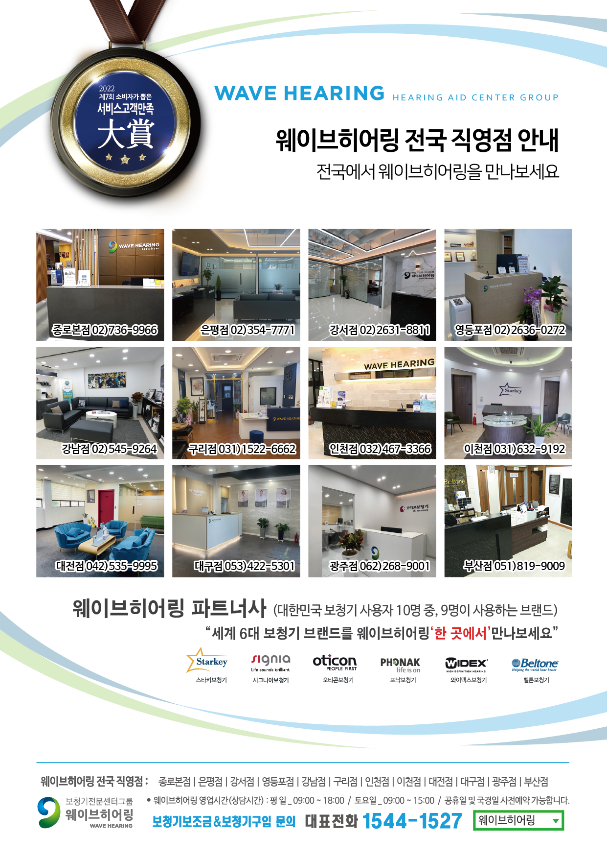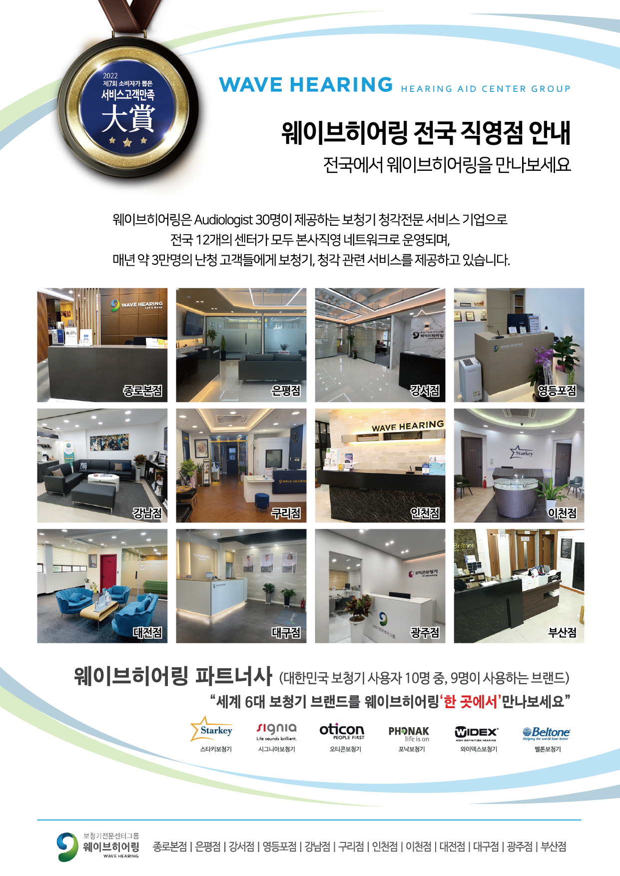 웨이브히어링은 올해 1월 은평점 (불광역 / 베토벤 보청기 인수), 4월 강서점 (발산역) 을 오픈하여 운영중이며 가까운 지점에 전화 문의 후 방문 시 전국에서 서비스를 받아 볼 수 있다.