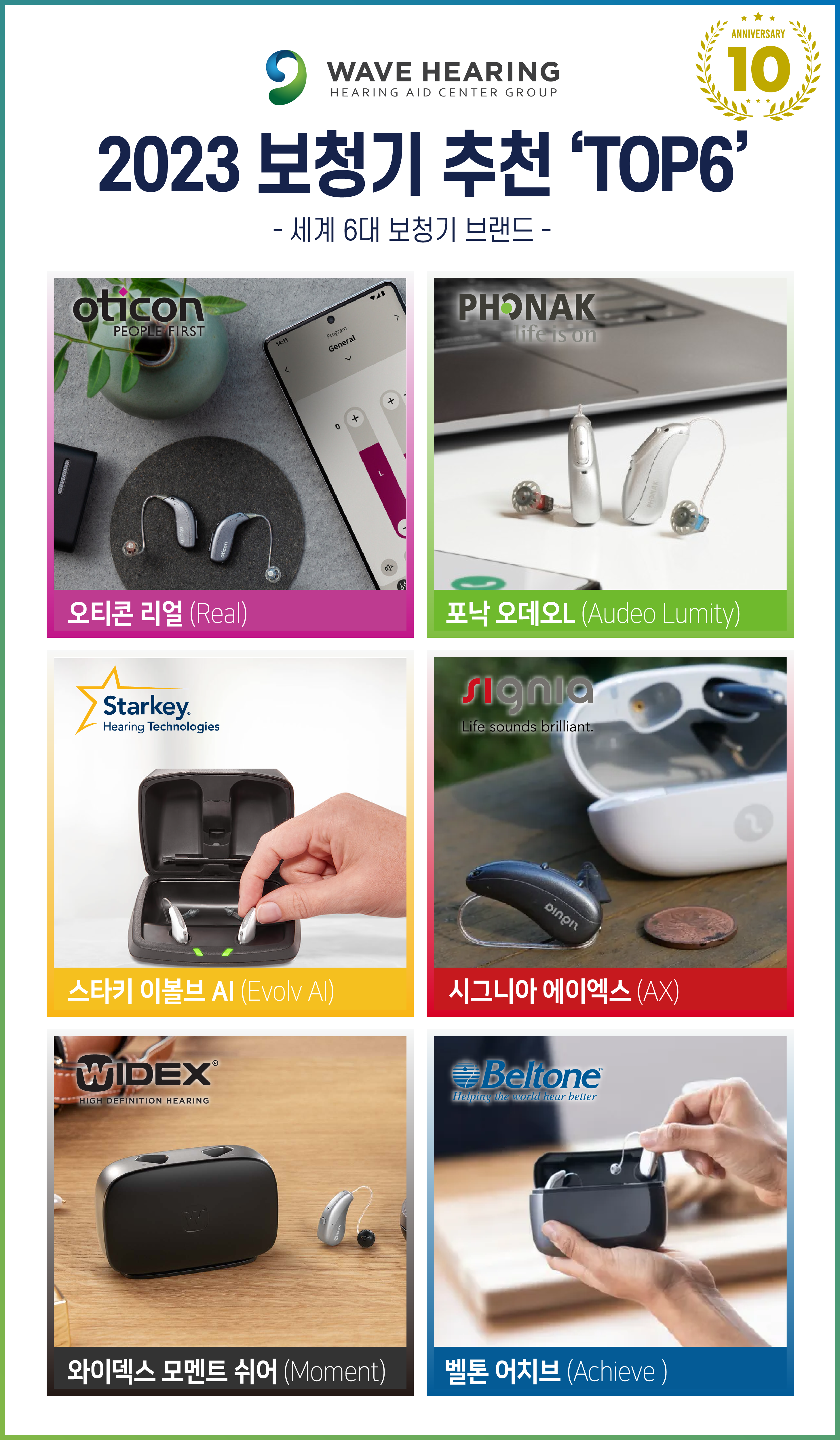 웨이브히어링은 원스토어 멀티브랜드 전략으로 전국 12개 직영체인망을 구축해 전국 난청인들을 위한 청각 전문서비스를 제공하고 있다. 웨이브히어링이 공급하는 세계 6대브랜드 (오티콘, 와이덱스, 포낙, 시그니아, 벨톤) 는 한국 보청기 사용자의 90%가 사용하는 보청기 제조사별 퍼스트브랜드(first brand) 이다.