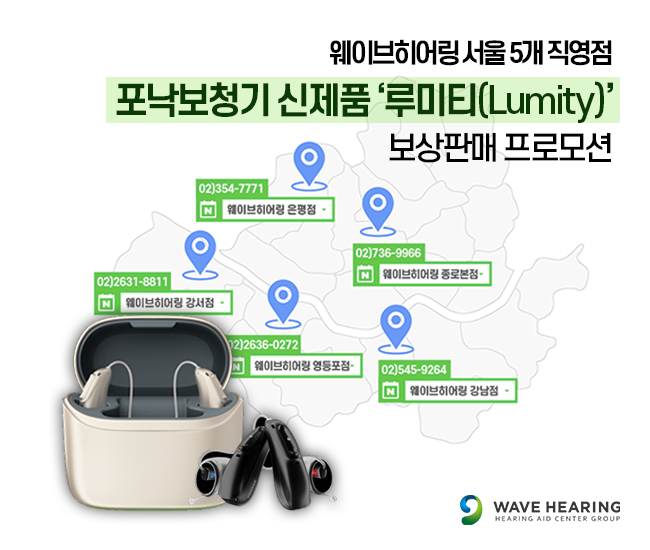 전국 12개의 센터를 본사 직영 네트워크로 운영하는 보청기·청각전문 서비스기업 <웨이브히어링> 서울직영점 (종로본점, 영등포점, 강남점, 은평점, 강서점)이 기존 포낙(Phonak) 보청기 사용자를 대상으로 포낙 신제품 루미티(Lumity) 라인의 보상판매 프로모션을 진행한다고 밝혔다.