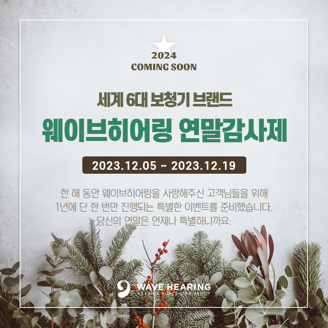 웨이브히어링은 지난 10월 창립 10주년을 맞이하면서, 매년 진행하는 ‘연말 감사제’를 진행한다고 밝혔다. 연말 감사제는 고객 감사의 의미로 신제품보청기를 기존 할인가에 추가 할인을 더하여 2023년 최대 할인율을 제공받아 구입할 수 있는 좋은 기회라고 밝혔다.