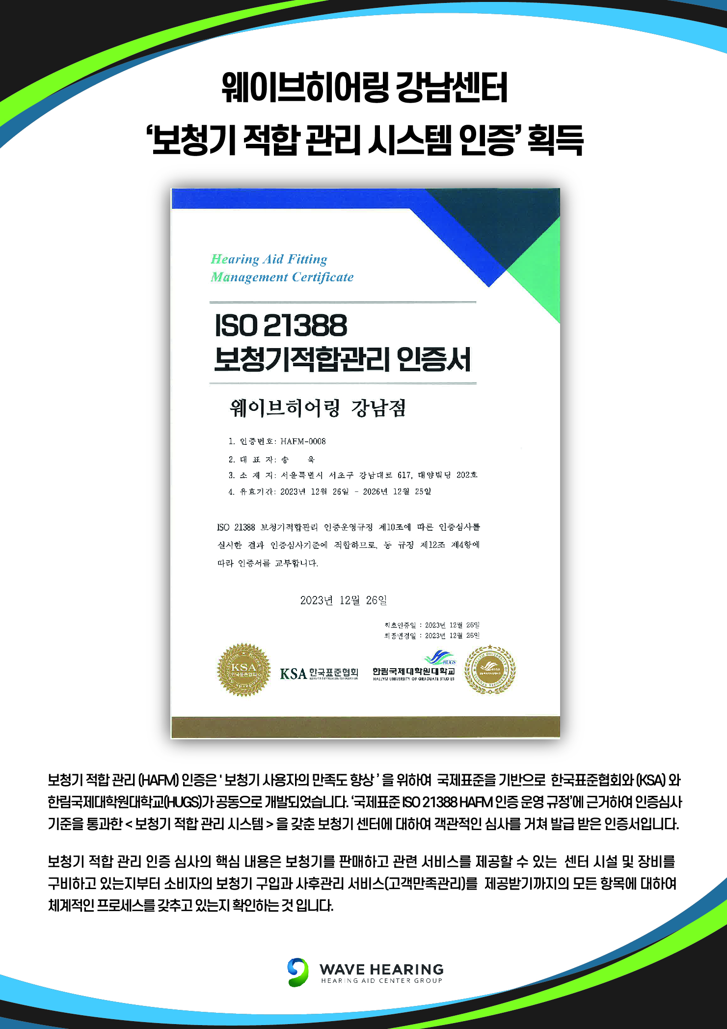 청각 & 보청기 전문가그룹 웨이브히어링은 국제표준 ISO 21388 보청기적합관리(HAFM) 시스템 인증을 완료했다고 9일 밝혔다. 국제표준 ISO는 International Standard Organization의 약자로, 국제적인 기준을 정하는 비정부 국제기구를 의미하며, 국제적인 기준을 충족하는 인증인 만큼 인증이 완료된 센터는 대외적으로 증명이 되었다고 볼 수 있다.