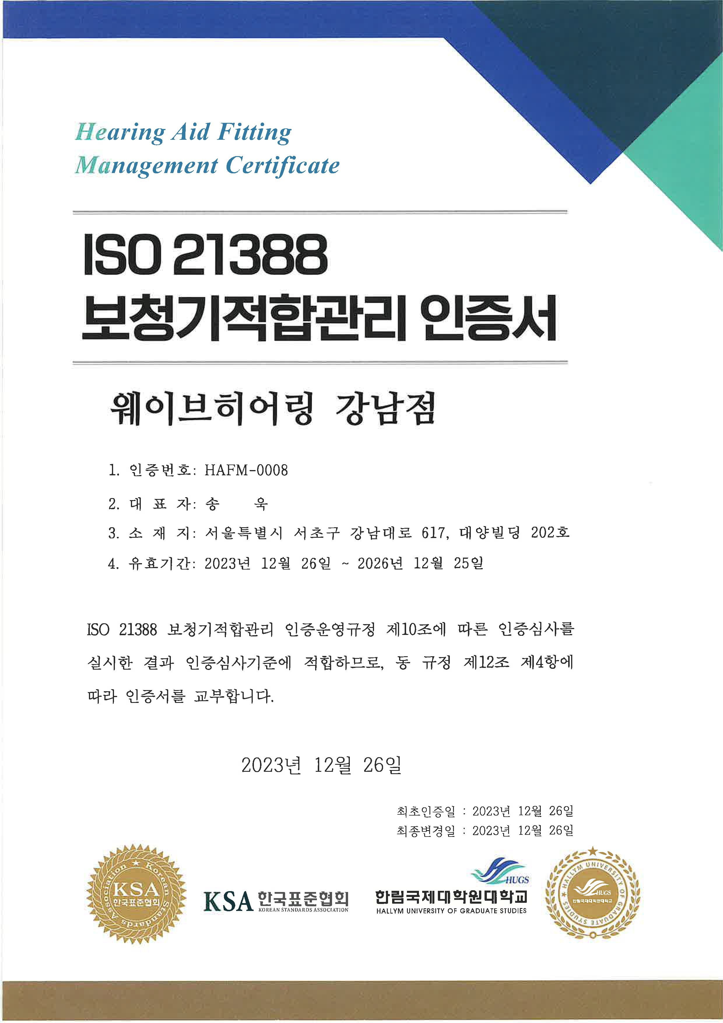 이번에 완료된 보청기적합관리(HAFM)인증은 ‘보청기 사용자의 만족도 향상’을 위하여 국제표준을 기반으로 한국표준협회와(KSA)와 한림국제대학원대학교(HUGS)가 공동으로 개발한 ‘국제표준 ISO 21388 HAFM 인증 운영 규정’에 근거해 인증심사기준에 부합한 보청기적합관리시스템을 갖춘 국내외 보청기센터에 대하여 객관적인 심사를 거쳐 인증서를 발급해주는 제도이다.