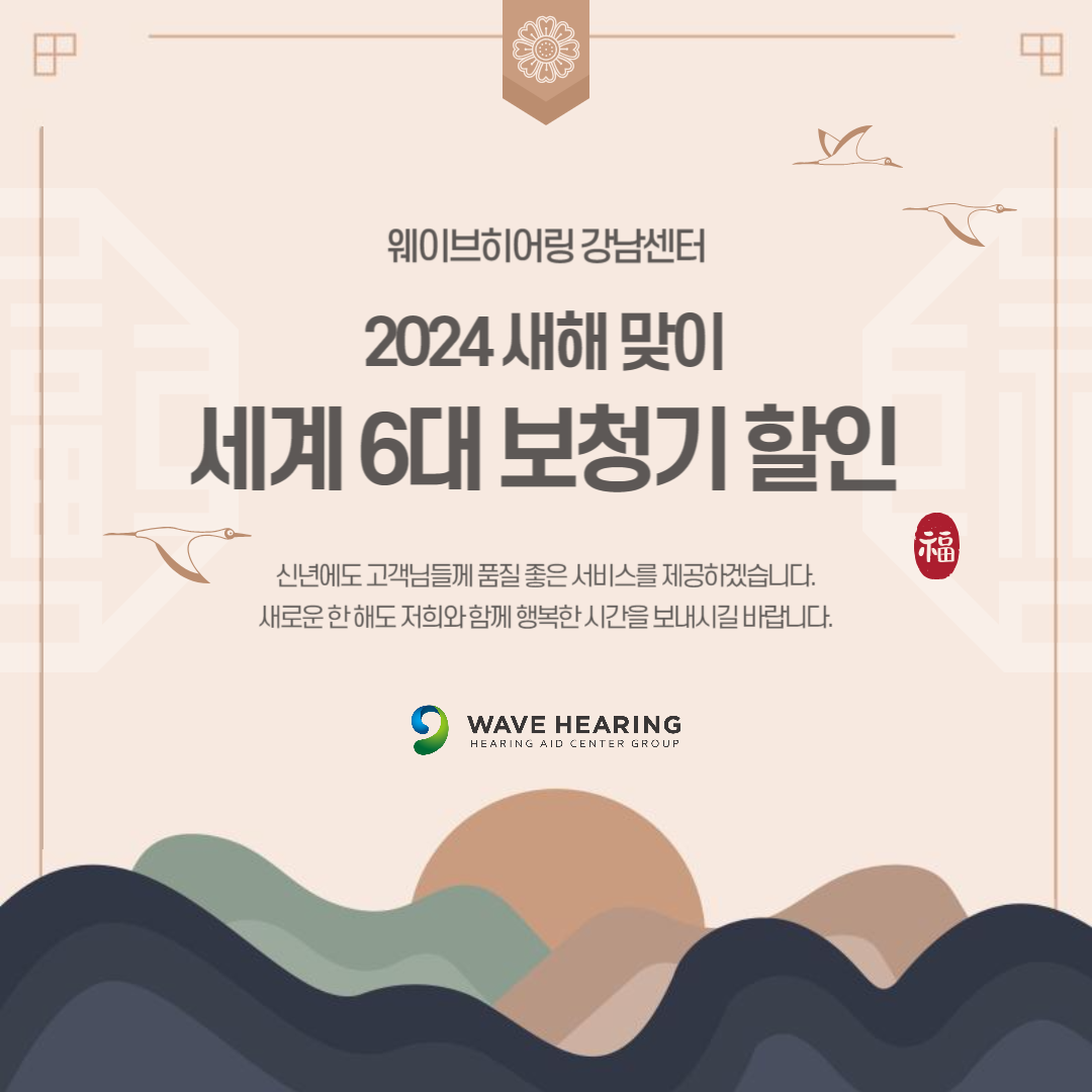 청각 & 보청기 전문가그룹 웨이브히어링 강남센터는 2024년 새해를 맞이하여 세계 6대 보청기 최대 할인 프로모션을 오는 2월까지 진행합니다.