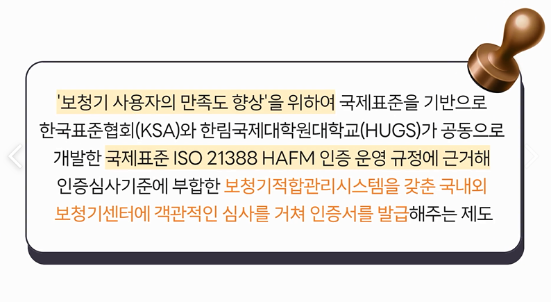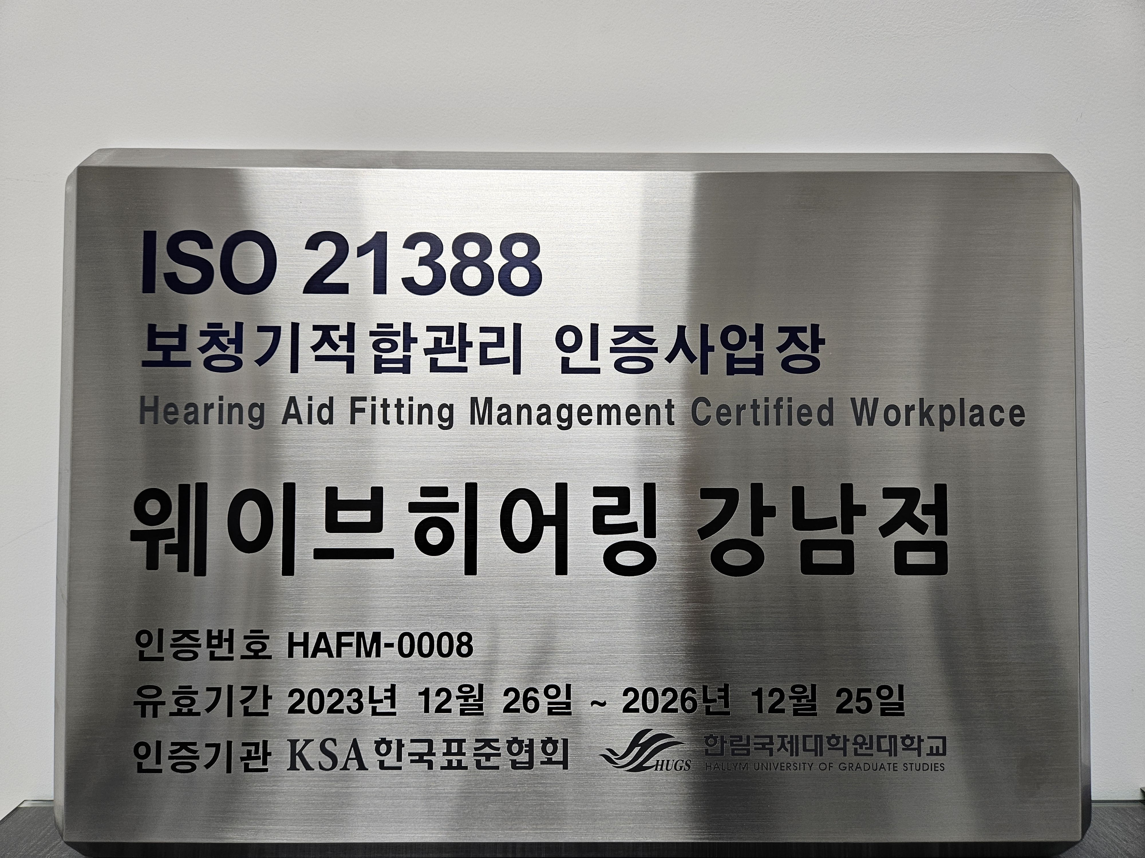지난 2023년 연말에 웨이브히어링 강남센터는 보청기적합관리(HAFM)인증 센터로 ‘보청기 사용자의 만족도 향상’을 위하여 국제표준을 기반으로 한국표준협회와(KSA)와 한림국제대학원대학교(HUGS)가 공동으로 개발한 ‘국제표준 ISO 21388 HAFM 인증 운영 규정’에 근거해 인증심사기준에 부합한 보청기적합관리시스템을 갖춘 국내외 보청기센터로 인정을 득하였습니다.
