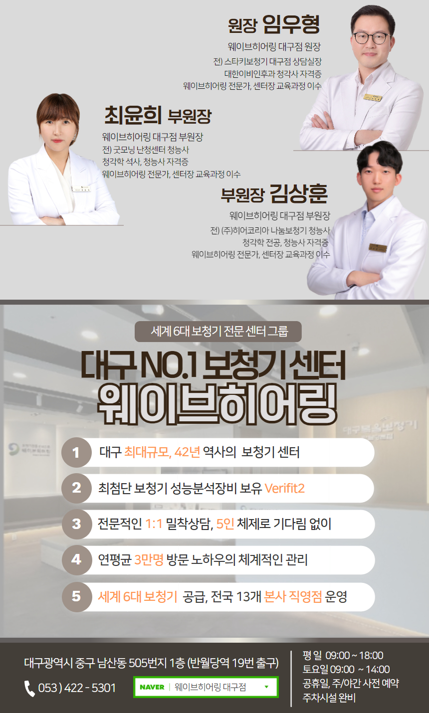 웨이브히어링은 대구 반월당에 복음보청기 본점을 운영을 해오고 있으며 내달 3월초 대명역에 대구 직영 2호점(대명역 복음보청기) 오픈을 앞두고 있다. 웨이브히어링은 대구 직영 2호점을 포함하여 전국에 본사 직영 14호점을 앞두고 있다. 웨이브히어링 대구점 보청기 상담 문의는 대표번호나 가까운 웨이브히어링 직영점으로 전화하면 안내 받을 수 있으며, 네이버를 통한 온라인 예약도 가능하니 참고 바란다.