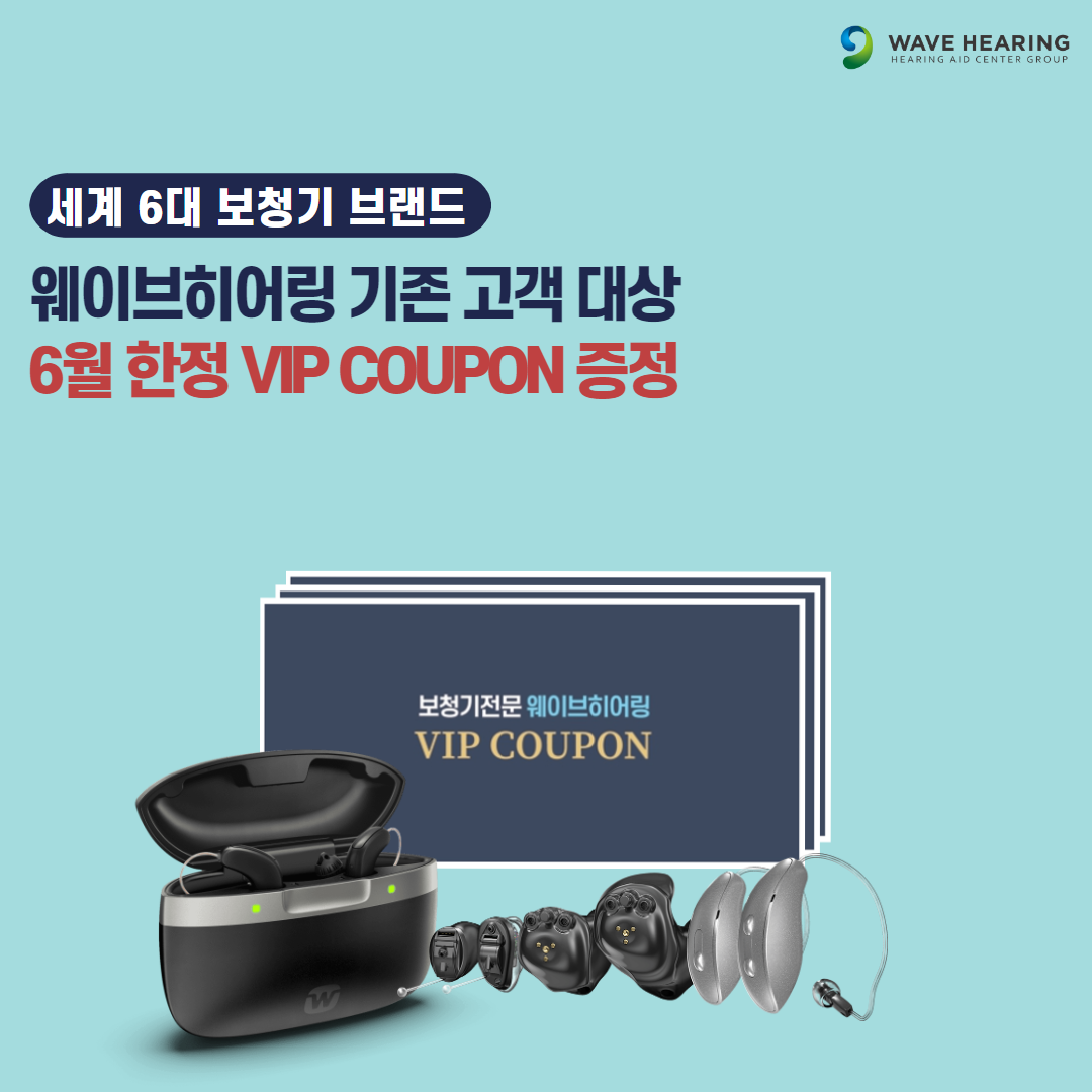 세계 6대 보청기 브랜드를 한 곳에서 비교 구입할 수 있는 보청기 전문센터그룹 웨이브히어링이 전국 14개 직영점에서 보청기를 구입하고 관리를 받고 있는 기존 고객 30,000여 명을 대상으로 올해 연말까지 사용 가능한 VIP COUPON 4종을 6월 한정으로 발행한다고 밝혔다.