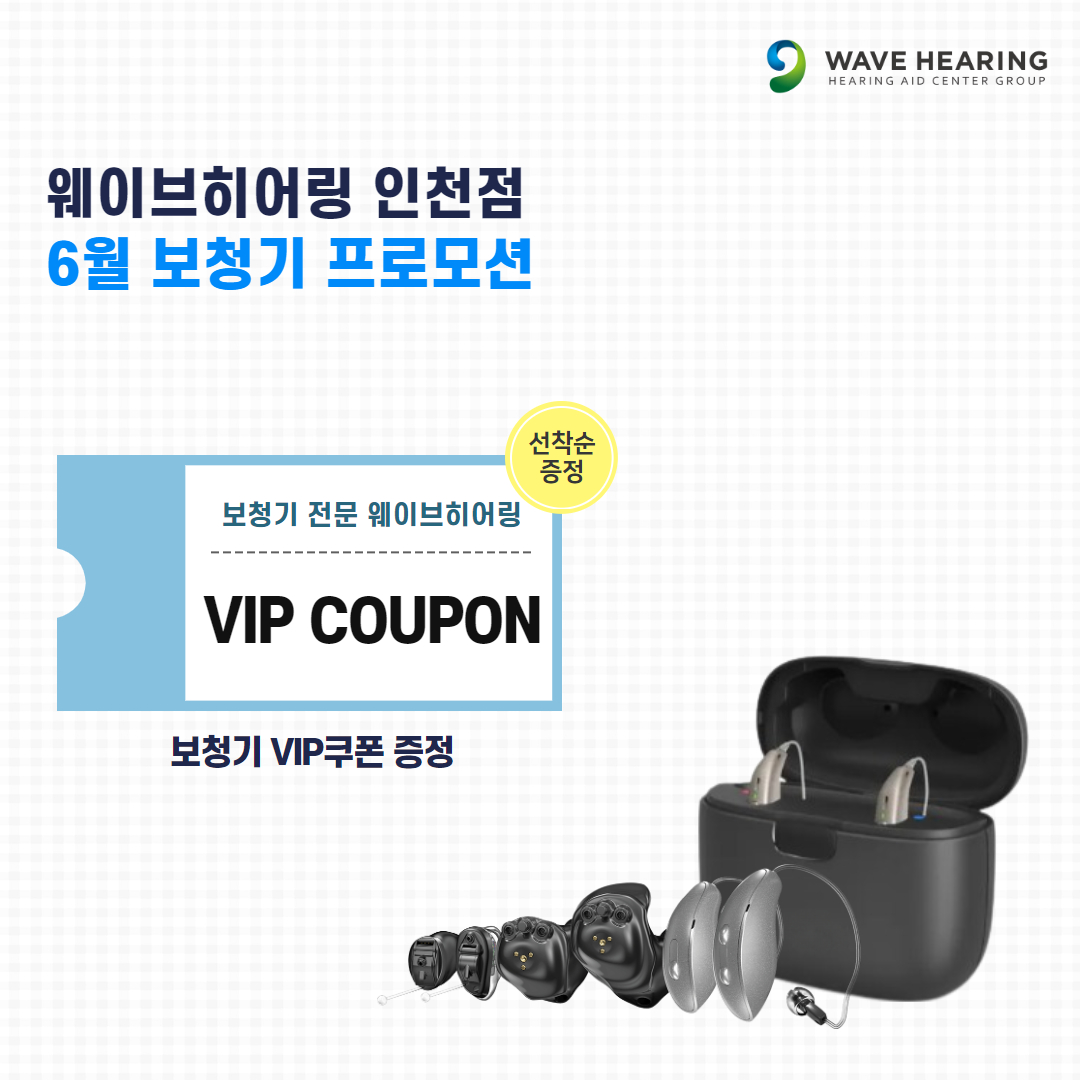 청각 & 보청기 전문센터 그룹 웨이브히어링의 인천점이 6월 한정으로 인천점에서 보청기를 구입 후 관리 받고 있는 기존 고객들에게 “보청기 VIP쿠폰”을 선착순 증정한다고 밝다.