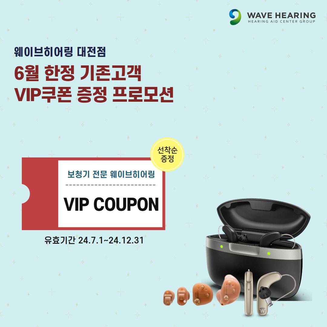 청각 & 보청기 전문센터그룹 웨이브히어링 대전 직영점에서 대전점을 방문해온 기존 고객들을 대상으로 6월 한정 “보청기 VIP쿠폰”을 증정한다고 밝혔다.