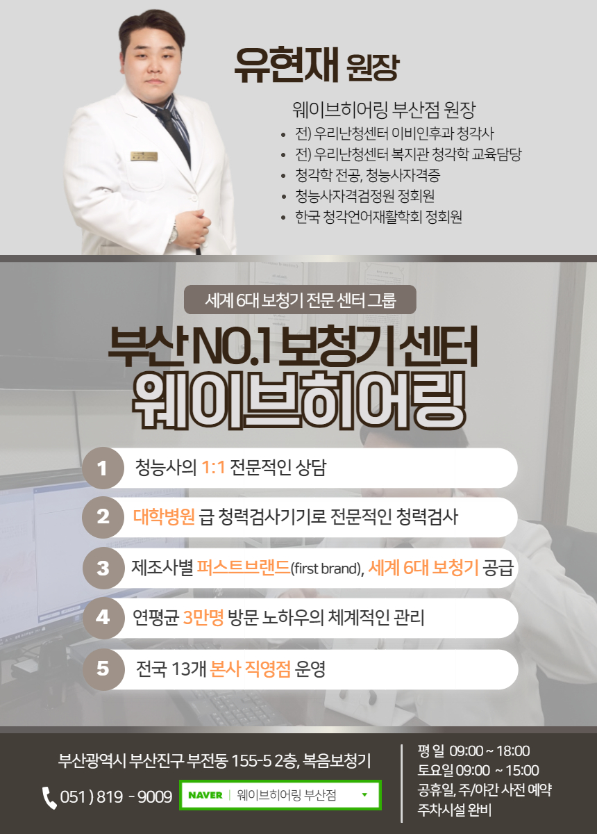 전국 14개 본사 직영으로 운영되는 웨이브히어링 부산직영점은 총 2곳으로, 1호점(부산벨톤점)이 서면역 6번 출구, 2호점(부산복음점)이 서면역 롯데백화점 맞은편에 위치해있다.