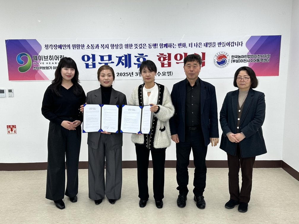 보청기 전문센터그룹 웨이브히어링 이천점이 지역 내 1,500여 명의 청각·언어 장애인의 원활한 소통과 복지 향상을 구축하기 위해 한국농아인협회 이천시지회 부설 이천시수어통역센터와 업무협약(MOU)을 체결하였다고 밝혔다.