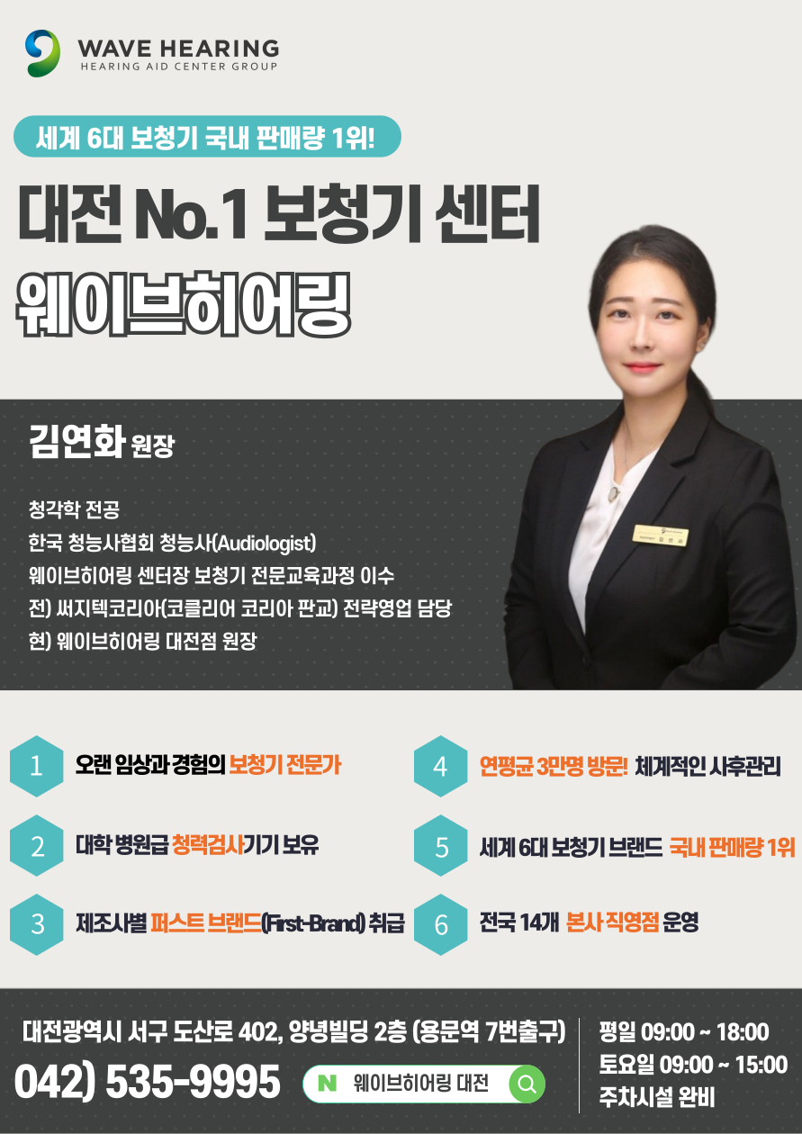 대전점 김연화 원장은 “30년 동안 대전을 대표하는 보청기 전문센터로 자리 잡을 수 있었던 것은 고객들의 꾸준한 신뢰 덕분”이라며 “넓어진 공간과 더 나은 서비스로 고객 한 분 한 분께 진심을 다해 보답하겠다”고 전했다.