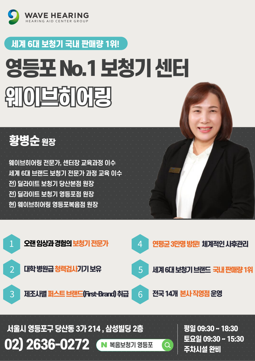 웨이브히어링은 전국 14개 직영점을 통해 정밀 청력 진단, 보청기 피팅, 사후 관리까지 통합적인 청각 전문 서비스를 제공하고 있으며, 영등포점 역시 지역 내에서 높은 신뢰와 만족도를 기반으로 운영되고 있다.