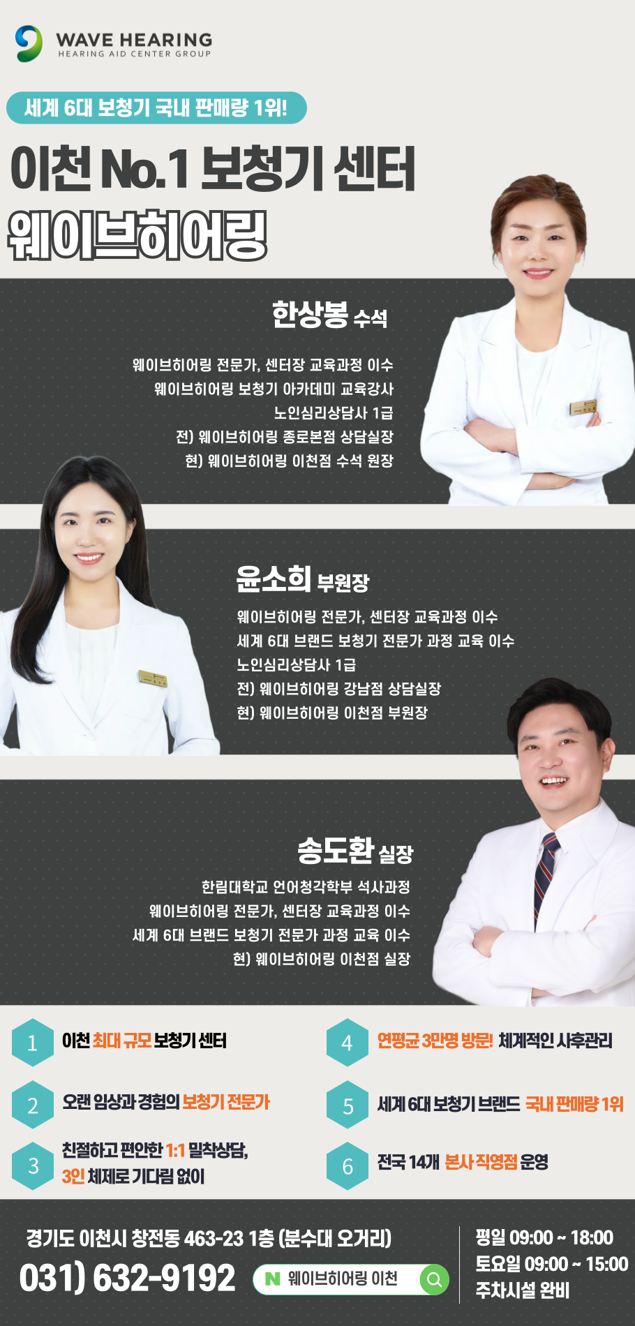 웨이브히어링 | 송욱 | 서울시 종로구 율곡로 56 운현하늘빌딩 2층 | 사업자 등록번호 : 101-86-84215 | TEL : 02-736-9966 | Mail : 08rose@hanmail.net | 통신판매신고번호 : 2016-서울종로-0885호 | 사이버몰의 이용약관 바로가기