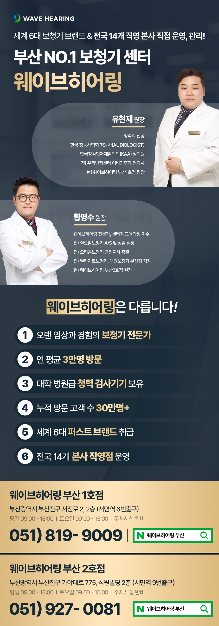 웨이브히어링 부산점은 부전동, 범천동, 전포동, 연산동, 초읍동 등 서면 일대와 인근 지역 고객들이 쉽게 방문할 수 있는 위치에 자리하고 있다. 센터는 정밀 청력 검사와 1:1 맞춤 상담, 장기 사후 관리까지 체계적으로 지원하며, 단순한 보청기 판매가 아닌 청각 케어 전반의 토털 서비스를 제공하는 것이 특징이다.