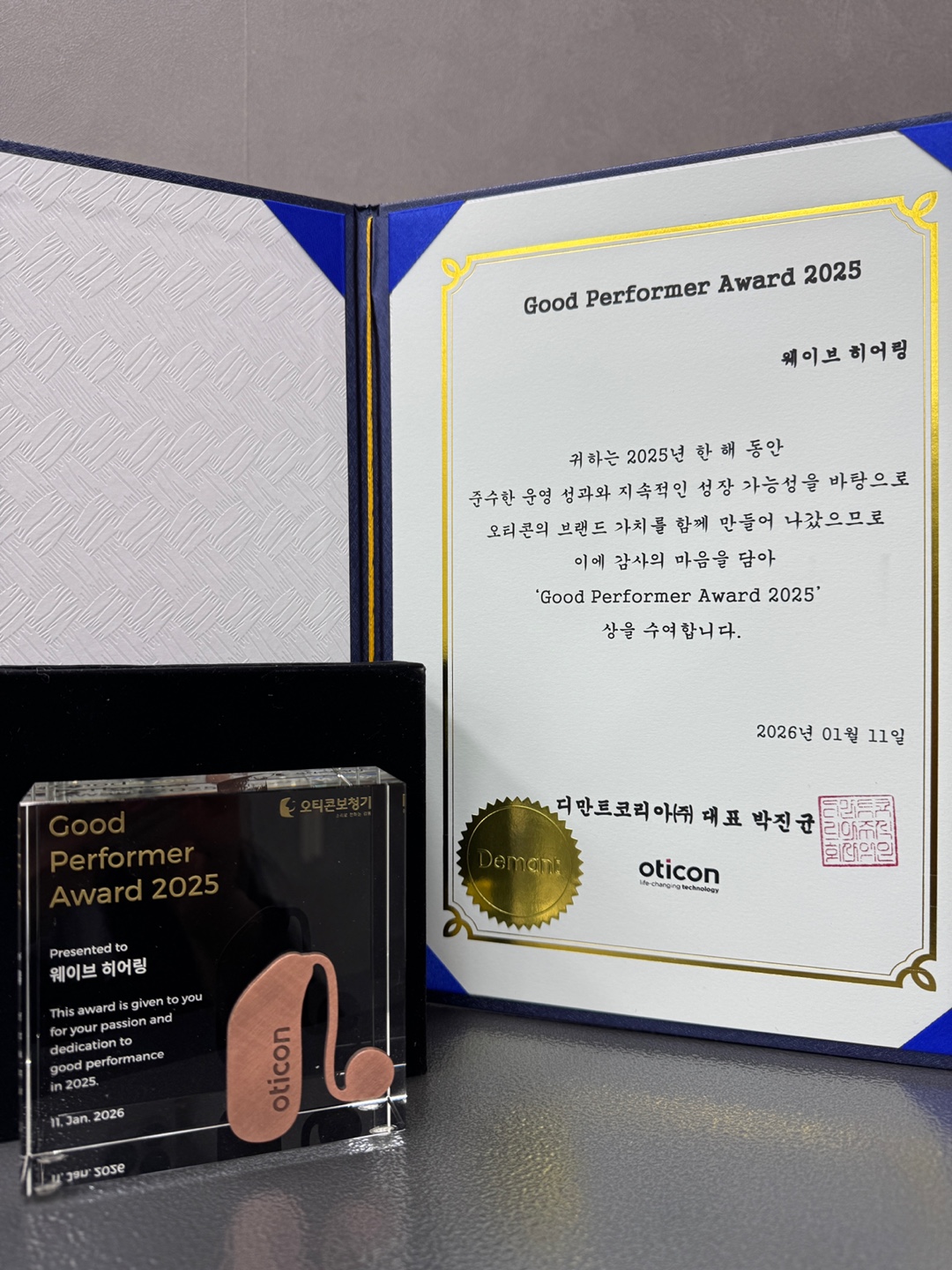 보청기 전문센터그룹 웨이브히어링이 지난 11일 더플라자 호텔 서울에서 개최된 ‘2026디만트코리아 오티콘(Oticon) 정책 발표 세미나’에서 ‘굿 퍼포머(Good Performer)’상을 수상했다.
