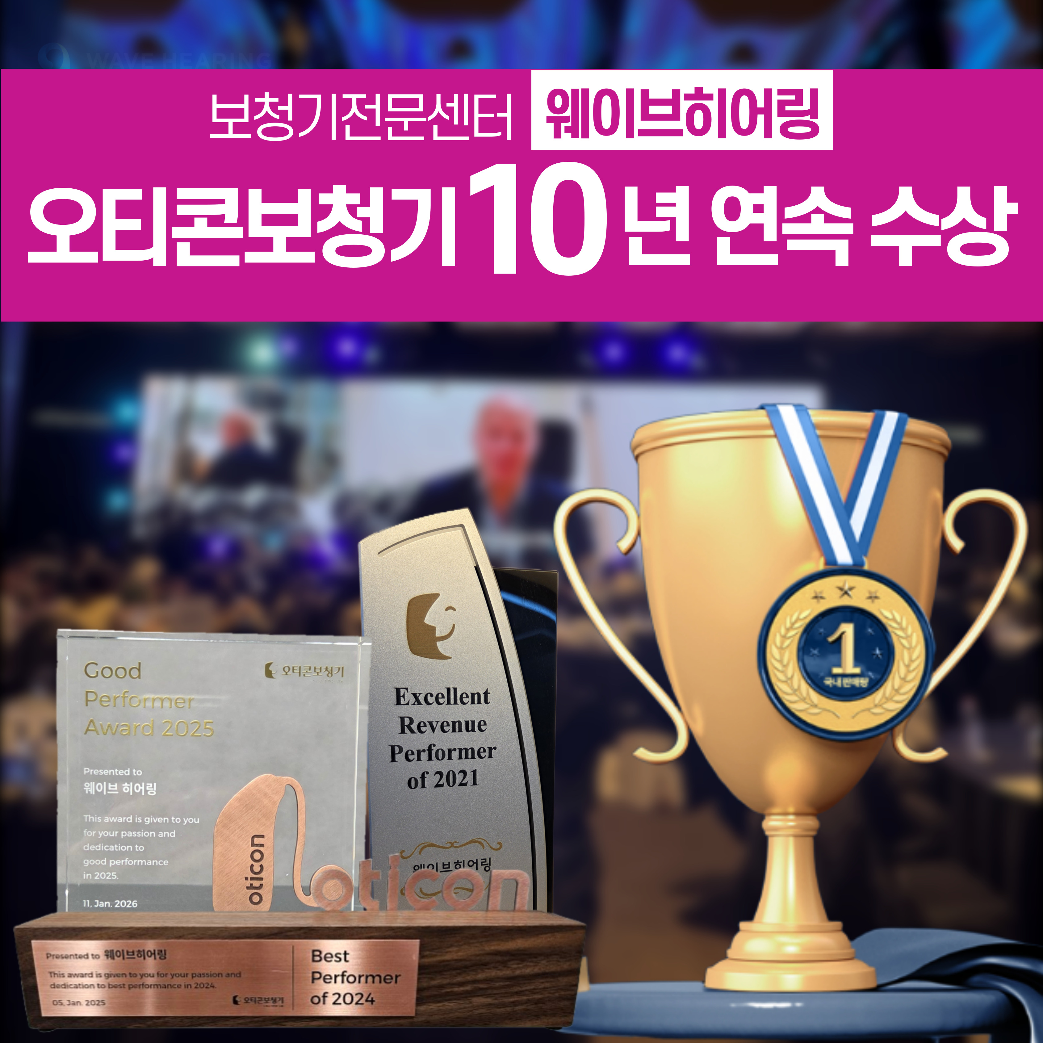 보청기 전문센터그룹 웨이브히어링 종로본점이 덴마크 브랜드 오티콘(Oticon)으로부터 ‘10년 연속 우수 센터’로 선정된 것을 기념해, 난청인들이 가장 선호하는 핵심 모델을 엄선하여 선보이는 ‘오티콘 베스트셀러 특별 프로모션’을 진행한다고 22일 밝혔다.