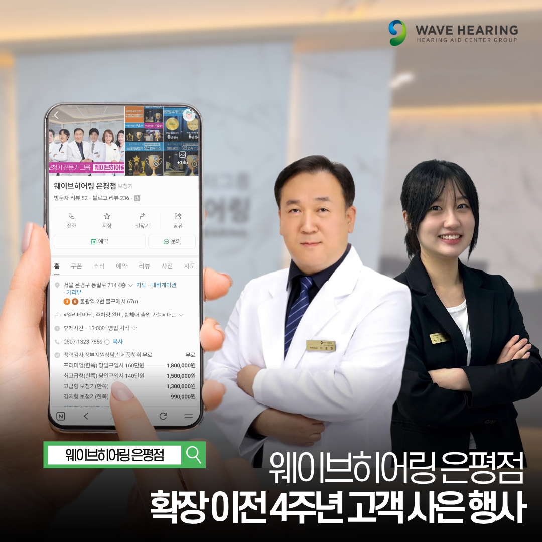 이번 확장이전 4주년 기념 사은 행사는 사전 예약제로 진행되며 방문 예약에 대한 자세한 내용은 웨이브히어링 은평점(불광역 인근) 고객센터를 통해 확인할 수 있다.