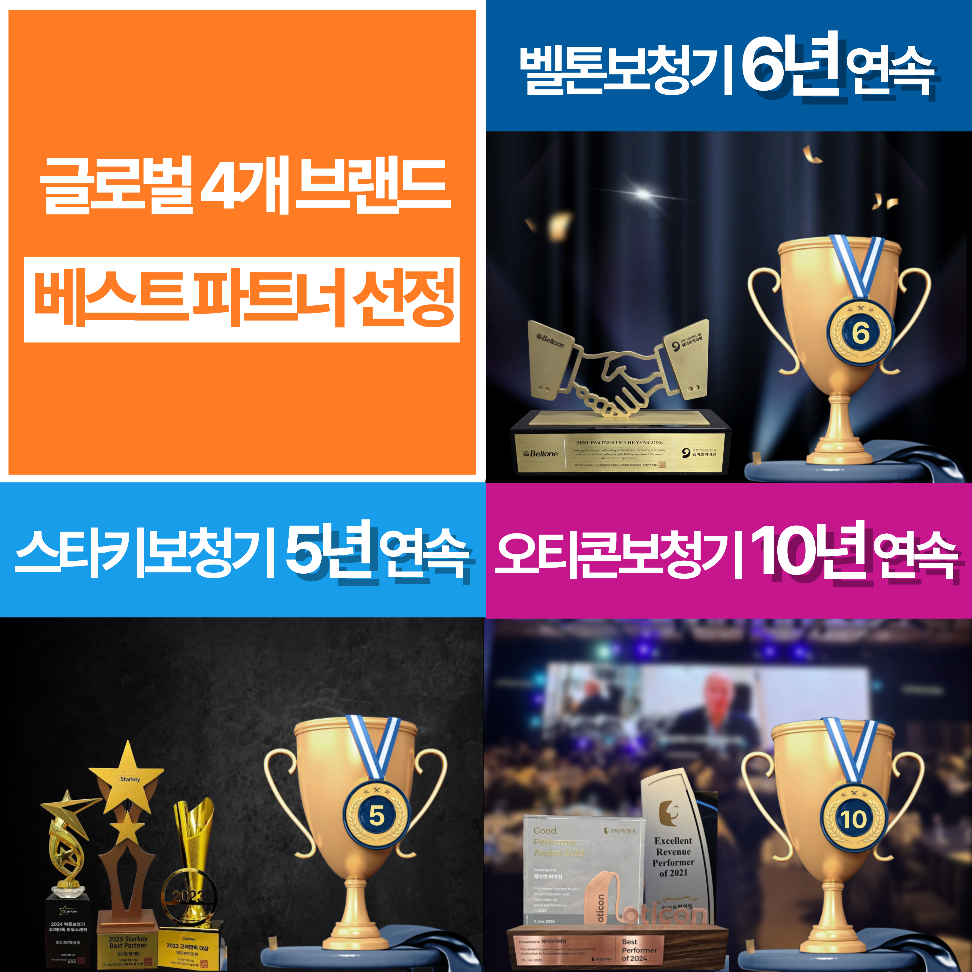 먼저, 비용 부담으로 보청기 구입이나 교체를 망설였던 고객들을 위해 전 품목 특별 할인전을 실시한다. 가성비가 뛰어난 경제형 모델부터 오티콘 인텐트, 벨톤 인비전, 시그니아 BCT IX, 스타키 엣지AI, 와이덱스 얼루어 등 주변 소음을 스스로 제어하는 최신 프리미엄 라인업까지, 다양한 등급의 보청기를 확장이전 4주년 기념 특가로 제공하여 고객의 선택 폭을 넓혔다.