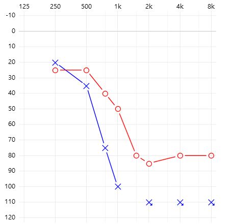 2KHz이후 스켈아웃(소리 자극에 전혀 반응이 없는 상태)으로 실제 왼쪽 귀 청력은 가청 주파수 범위가 절반(250~1KHz) 정도만 남아 있는 상황.