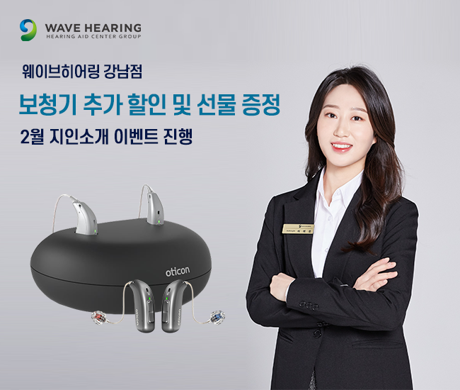 청각&보청기 전문가그룹 웨이브히어링 강남센터는 2월 한달 동안 지인소개로 보청기를 구입할 경우 추가 할인 제공과 소개자에게는 소정의 선물을 증정한다고 밝혔다.