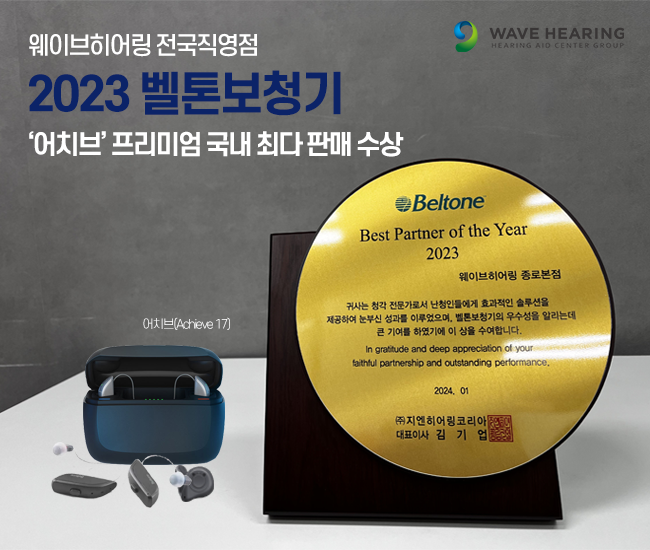 웨이브히어링은 청각 & 보청기 전문가로서 난청인들에게 효과적인 솔루션을 제공하고, 벨톤보청기의 우수성을 알리는데 큰 기여한 공로와 성과를 인정 받아 수상했다고 전했다. 여기에는 전국 15개 직영점 외에 AK히어링이라는 별도 홀세일 법인을 통해 GN그룹의 벨톤 보청기를 전국 200여개 대리점에 공급하여 국내 판매량 1위를 달성한 기록이 뒷받침 되었다고 덧붙였다.