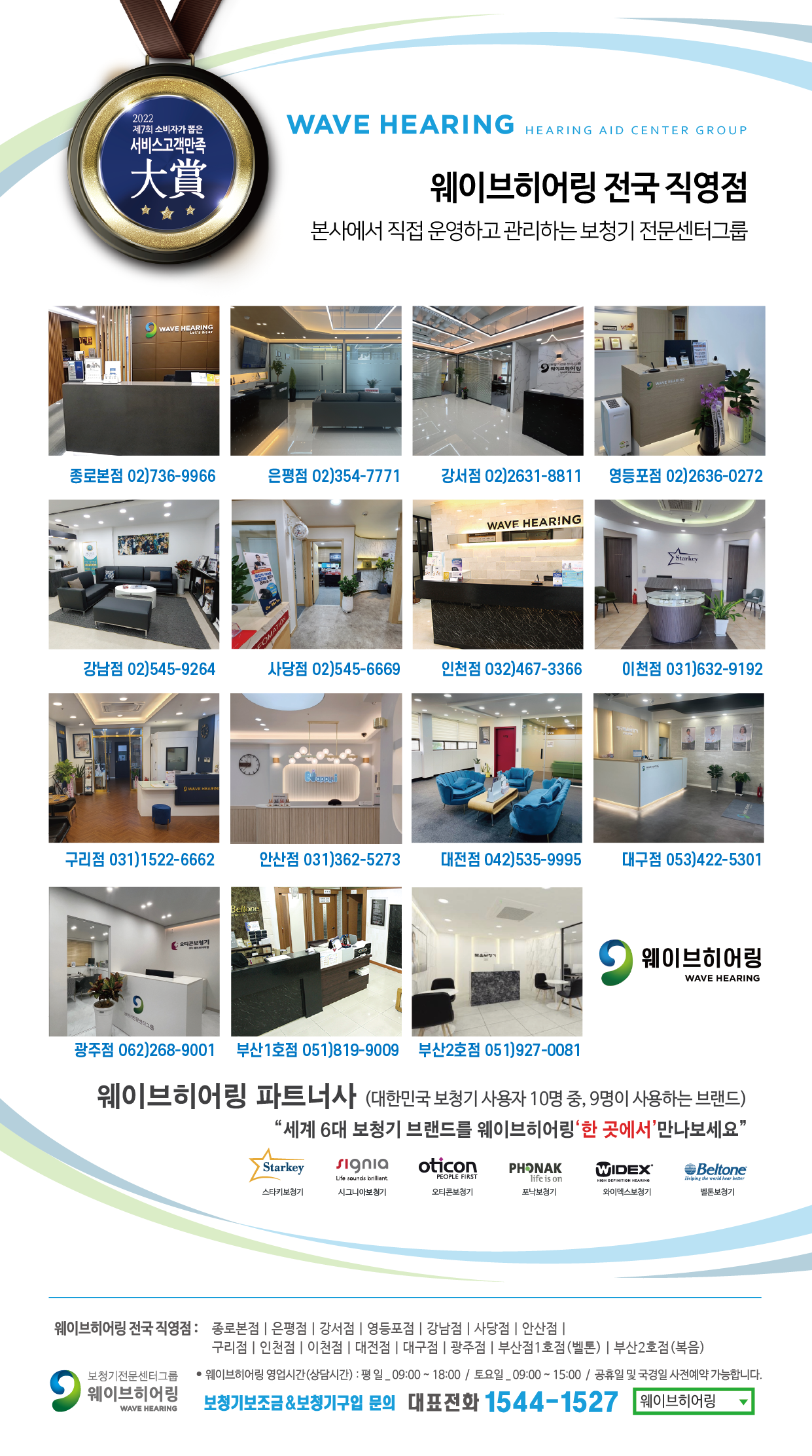 웨이브히어링 이천점은 '스타키보청기 이천점'과 '오티콘보청기 이천점'을 동시에 운영하고 있으며, 올해 오티콘 보청기 ‘전국 최우수 센터상(Great Performer of 2023)’을 8년 연속 수상과 스타키보청기 고객만족대상을 수상한 바가 있다.