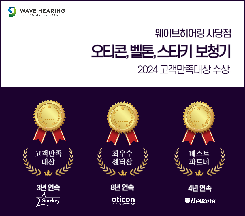 웨이브히어링은 GN그룹사의 벨톤보청기로부터 2023 최고 파트너(Best Partner of the Year)상을 4년 연속, 스타키보청기 신제품 출시 기념 세미나에서 ‘2023 고객만족 대상’을 3년 연속, 디만트그룹 오티콘보청기 정책세미나에서 ‘전국 최우수 센터상(Great Performer of 2023)’을 8년 연속 수상한 바가 있다.