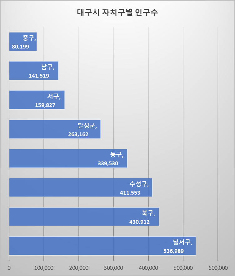 | 대구광역시 | 1 | 달서구 | 525,600 | 92,212 | 31 |