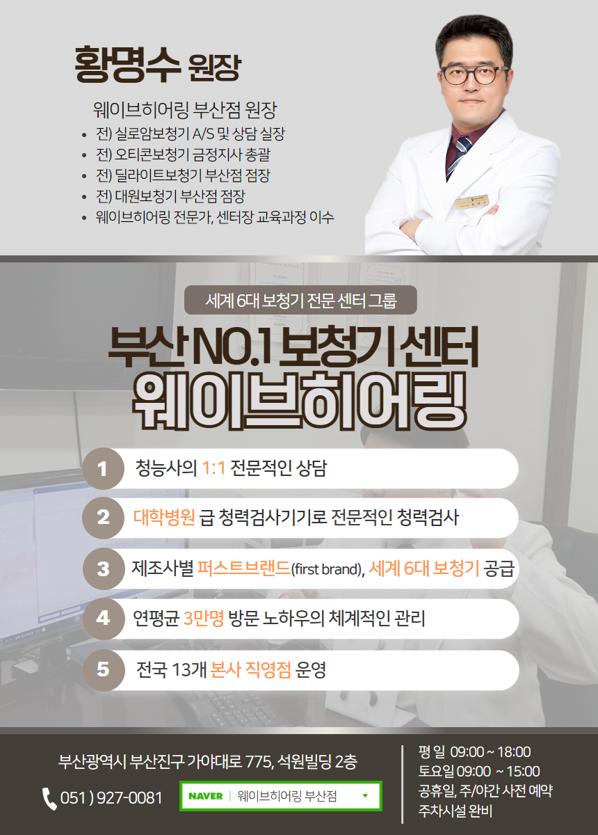 웨이브히어링 부산직영점은 서면역 6번 출구 1호점(부산벨톤점), 서면역 9번 출구 2호점(부산복음점)으로 운영되고 있다. 웨이브히어링은 8월 정식 출시를 앞둔 오티콘 인텐트의 공식 사전판매 대리점이 되어 신제품을 두 달 먼저 선보일 수 있게 되었으며, 지난 12일 개최된 시그니아 IX 공식 런칭세미나에 참석한 바 있다.
