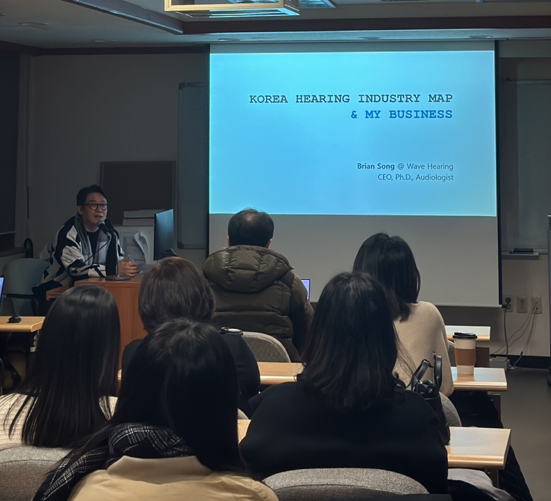 지난 12월 14일 한림국제대학원대학교 청각학 석사과정을 대상으로 웨이브히어링 브라이언송 대표(이학 박사, 청각학전공)의 창업특강 <"Korea Hearing Industry & My Business- 보청기센터 개원">이 진행되었다.